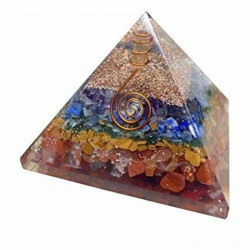 Pirámide de orgonite elaborada con resina de alta calidad, chips de 7 minerales relacionados con cada uno de los chakras, virutas metálicas y espiral de cobre.