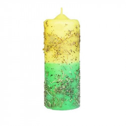 Velón amarillo y verde ritualizado con hierbas, resina y aceites esenciales.